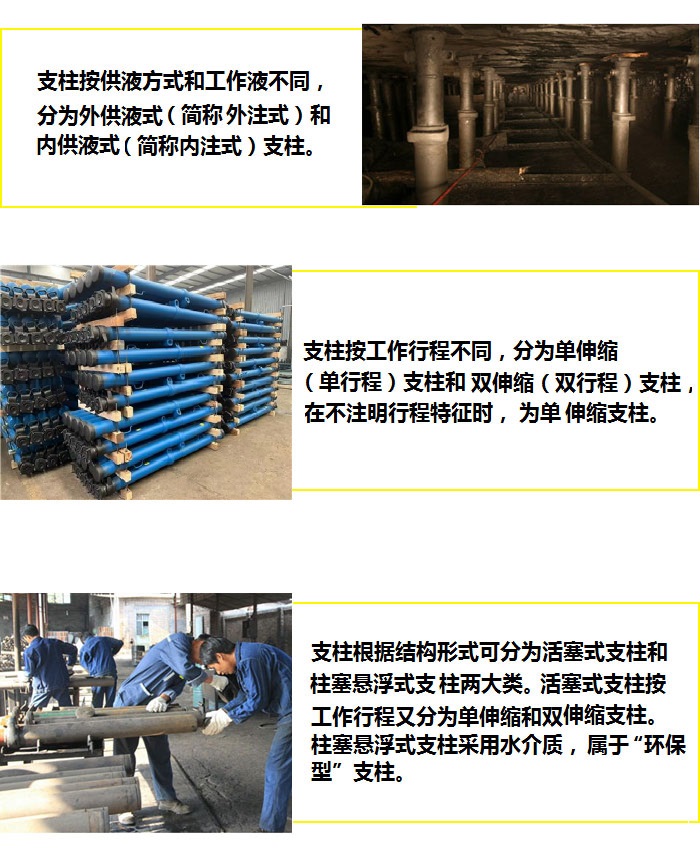DWX型悬浮式单体液压支柱具有工作阻力大、重量轻、使用寿命长、工作行程大、使用成本低、维修维护费用低、操作使用方便、使用范围广和稳定性好等特点,并可满足各种工况的技术要求。